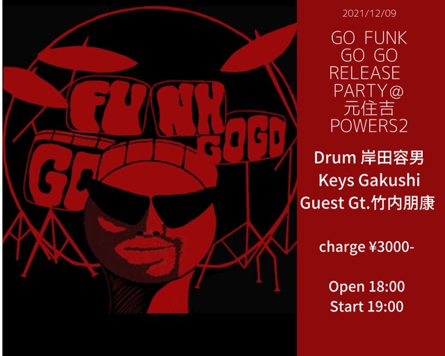日本のトップFUNKドラマー岸田容男のソロアルバム「GO FUNK GO GO」レコ発LIVE開催決定!プロデューサー&キーボーディストのGAKUSHI、Momiji&The BluestonesやPlanet Green、IWAZARU等で活躍するスーパーギタリスト竹内朋康を迎えスペシャルな一夜をお届けします!お楽しみに☆