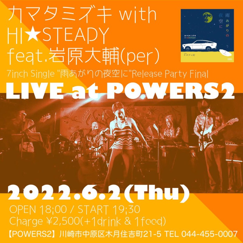今年三月に7inch「雨あがりの夜空に」をリリースし、今ノリにノッテる魅惑のトロピカルやさぐれバンドHI☆STEADYとカマタミズキがPOWERS2に登場!パーカッショニスト岩原大輔を迎えアゲアゲな一夜をお届けします!お楽しみに☆