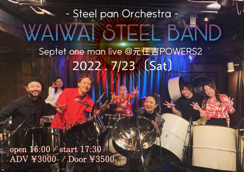 トリニダード・トバゴで生まれた楽器・スティールパンを通して独自のスタイルで追求する音楽を「WAIWAIミュージック」と提唱するWAIWAI STEEL BAND。2008年結成、世代とルーツを超え、よりソリッドなサウンドを貫く13人のメンバーが集結。突き抜ける多幸感と躍動感に溢れた音楽を世に解き放つ!今回は7人編成にてPOWERS2ワンマン開催決定!!お楽しみに☆