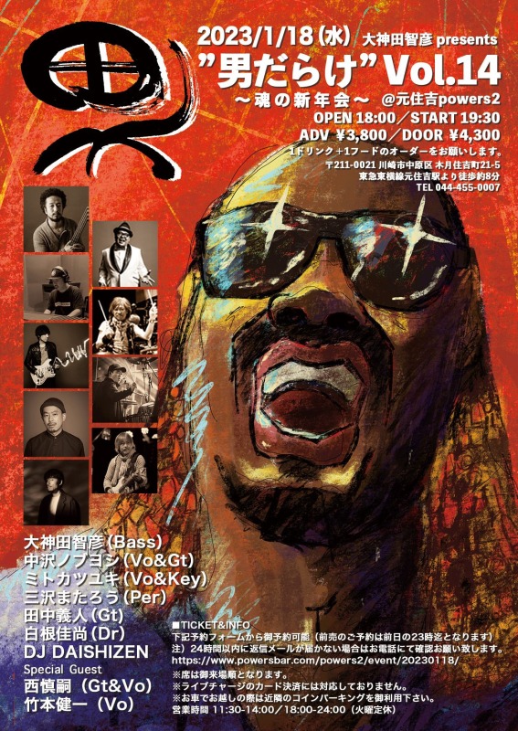 Big Duncan名義でも音源をリリースするなど今ノリにノッテるベーシスト大神田智彦が仕掛ける「”男だらけ”Vol.14 〜魂の新年会」開催決定!スペシャルゲストにレジェンドギタリスト西慎嗣と圧倒的な歌声で独自の世界観を表現するシンガーソングライター竹本健一を迎え、文字通り男だらけのスペシャルなメンバーでお届けするフェスティバル&カーニバルな新年会!お楽しみに☆