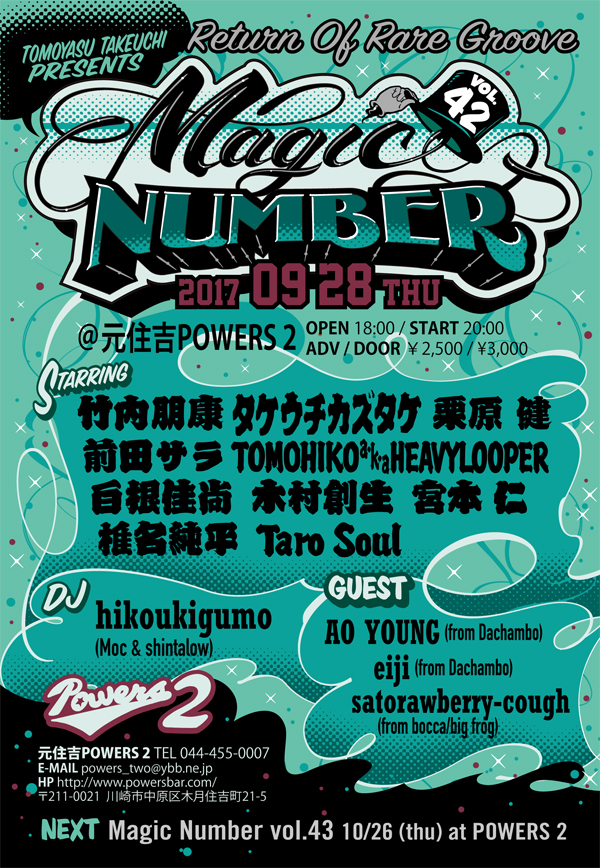 スーパーギタリスト竹内朋康 presents ”Magic Number Vol.42”開催決定!ゲストはDachamboのフロントマンAO YOUNGとベーシストeiji、そしてbocca、Big FrogのボーカリストSatorawberry-cough、JamBand界の重要人物が登場!DJはレペゼンPOWERS、Moc & shintalowによるhikoukigumo!!