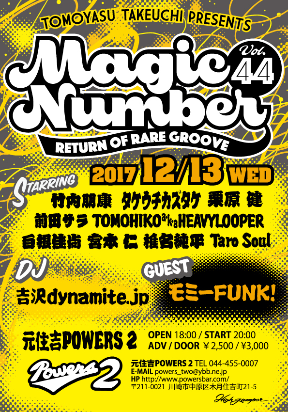 スーパーギタリスト竹内朋康 presents ”Magic Number Vol.44”開催決定!ゲストはプリンスも認めた逸材モミーFUNK!、そして和物レアグルーヴといえばこの人、吉沢dynamite.jp!年末に相応しいゴキゲンなメンツが揃いました!PARTYチューン満載でお届けします!!