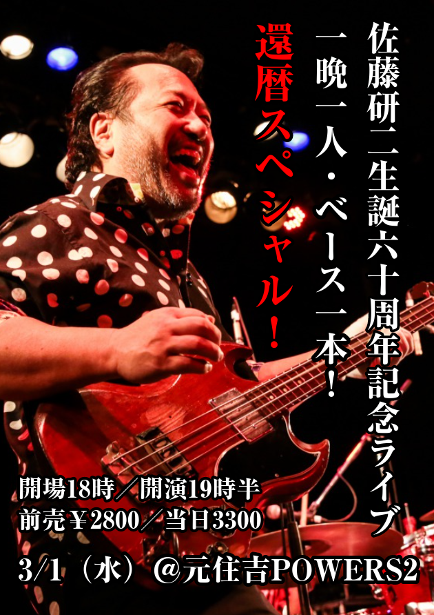 マルコシアス・バンプのベーシスト佐藤研二、生誕60周年記念ライブ開催決定!一晩一人・ベース1本!インストあり歌モノあり、もちろん超絶トークもあり!還暦だよ全員集合〜お楽しみあれ☆