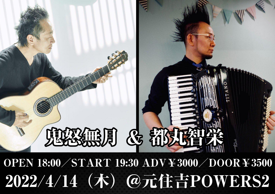COIL、是巨人、KIKI BAND、Bondage Fruit、ERA、FRET LAND等、数々のバンドで活躍する超絶ギタリスト鬼怒無月と京都のアコースティックトリオ「ザッハトルテ」のアコーディオン奏者・都丸智栄によるハイパーデュオがPOWERS2に初登場!お楽しみに☆