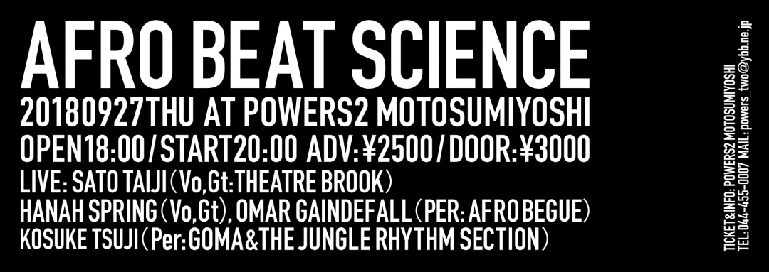 シアターブルックの佐藤タイジ、Afro Begueのオマール、GOMA & The Jungle Rhythm Sectionの辻コースケ、そして5オクターブの美声を持つHanah Springによる”Afro Beat Science”開催決定!強力なGROOVEで未知の領域へ迫る!!