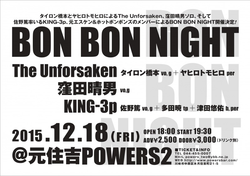 タイロン橋本とヤヒロトモヒロによるThe Unforsaken、窪田晴男ソロ、そして佐野篤率いるKING-3p、元エスケン&ホットボンボンズのメンバーによるBON BON NIGHT開催決定!