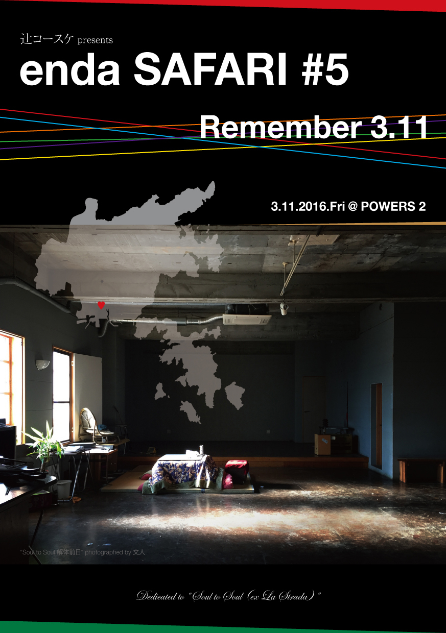 辻コースケpresents enda safari Vol.5!国内屈指のカリプソバンド・カセットコンロス、横浜発フォークロックバンドSTUMBLE BUM、椎野恭一+辻コースケのDuo、そして石巻からFUMITO+NOBUを迎え、震災以降毎年3.11に石巻で行われていた追悼LIVEが津波の危険区域で立ち退きとなってしまったため、今年は元住吉POWERS2にて「enda safari meets 石巻Session〜”Remember 3.11”」として開催決定!