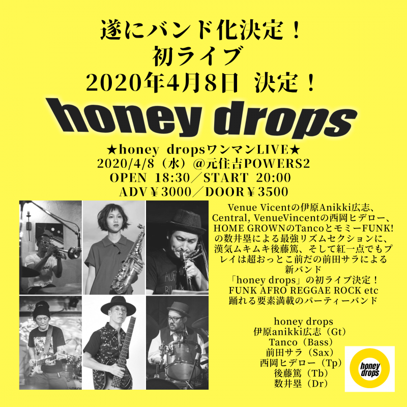 ★honey dropsワンマンLIVE★ 2020/4/8(水)@元住吉POWERS2