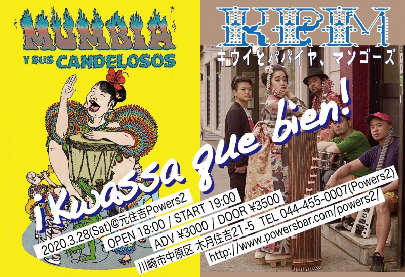 3月28日(土)@元住吉Powers2¡Kwassa Que Bien!〜Mumbia Y Sus Candelosos × キウイとパパイヤ、マンゴーズCOVID-19の世界的な流行に伴って有料でのライブ配信と並行、という形も視野に入れ開催準備を進めてきましたが、先日25日の都知事会見を受け、また感染者が広がりつつある実際の事実を考慮し、残念ながらまたの機会に延期させていただきます。新しい日程が決まり次第また告知させていただきます。KPMリーダー廣瀬からのご挨拶は以下からご覧ください。