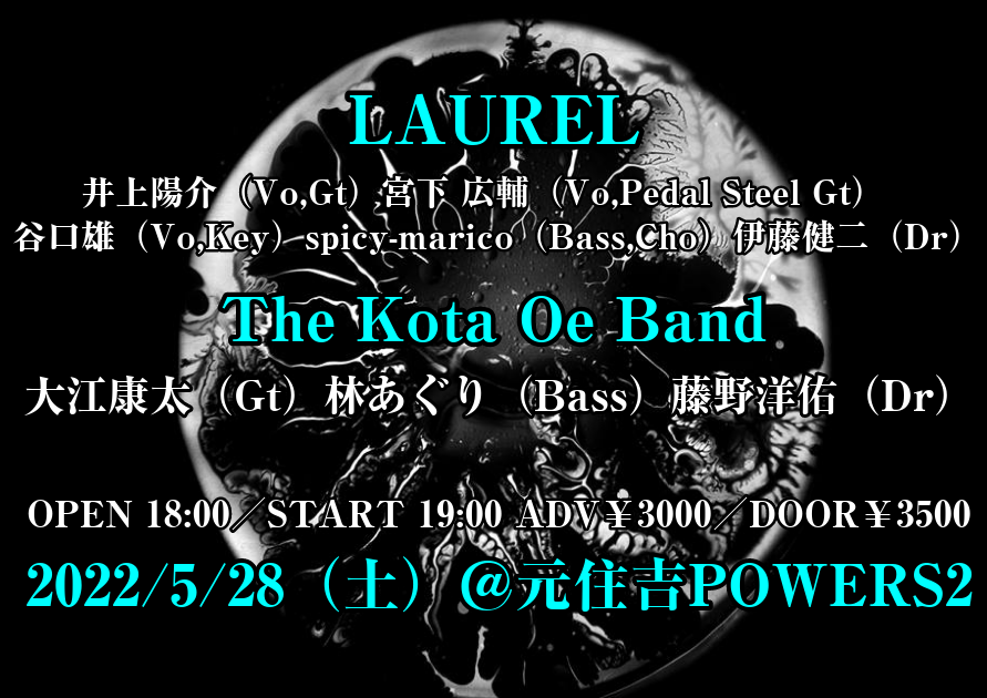ありとあらゆる音楽シーンで活躍中のメンバーによる新進気鋭のオルタナカントリーバンドLAURELと若手スライドギターの名手・大江康太率いるThe Kota Oe BandのツーマンLIVE開催決定!お楽しみに☆