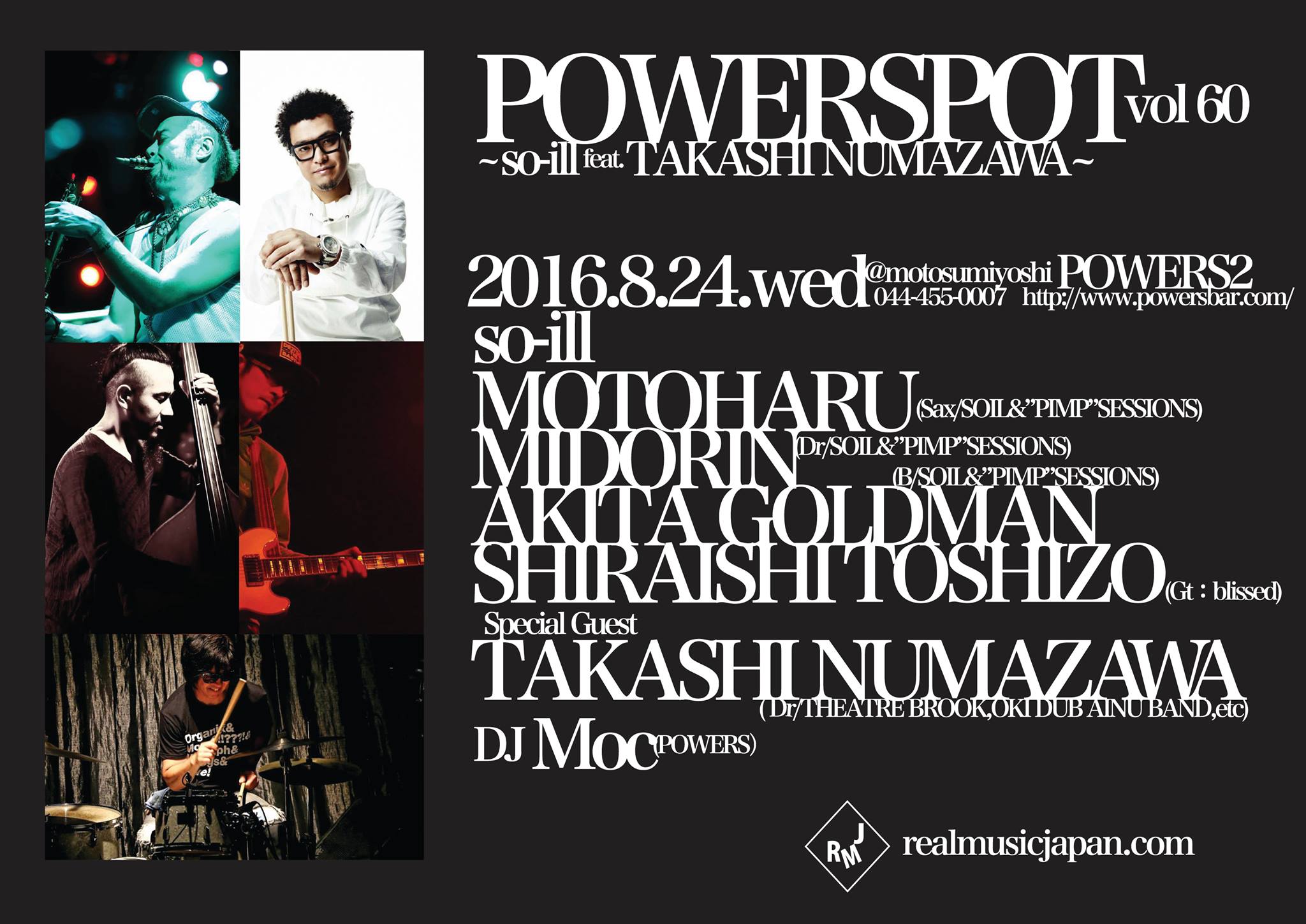 SOIL&”PIMP”SESSIONSの元晴、みどりん、秋田ゴールドマン、そしてblissedの白石才三からなるエクスペリメンタル Jazzユニット”so-ill”がPOWERS2初登場!ゲストにCHAKA KHAN、BOBBY WOMACK、SHIELA E.との共演経験を持つ”世界が認めたGROOVEドラマー”沼澤尚を迎えて送る予測不能のスーパーセッション!!