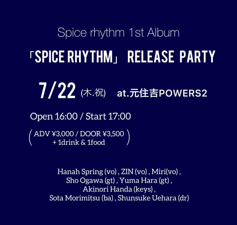 Ba.森光奏太とDr.上原俊亮 によるユニット、Spice rhythm の1st Album “SPICE RHYTHM”のリリースパーティー開催決定!ZIN(from Soulflex)、Hanah Springなど多数のSpecial guestを迎え、SoulでFunkなライブをお届けします!