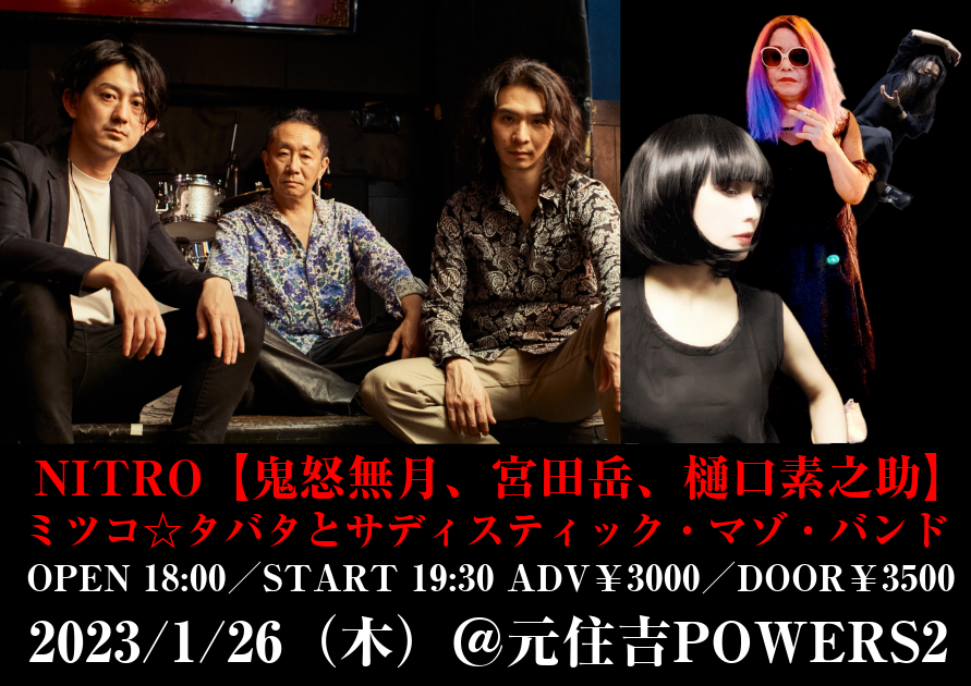 超絶ギタリスト鬼怒無月と頭脳警察のベーシスト宮田岳&ドラマー樋口素之助による爆薬系ロックバンドNITROとミツコ☆タバタ+中西智子+森川誠一郎によるミツコ☆タバタとサディスティック・マゾ・バンドのツーマン開催決定!ロックだぜ!カモーン!!