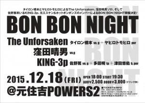 さらに詳しく »タイロン橋本とヤヒロトモヒロによるThe Unforsaken、窪田晴男ソロ、そして佐野篤率いるKING-3p、元エスケン&ホットボンボンズのメンバーによるBON BON NIGHT開催決定! ★BON BON NIGHT〜The Unforsaken×窪田晴男×KING-3p★ 2015/12/18(金)@元住吉POWERS2 OPEN 18:00/STA…