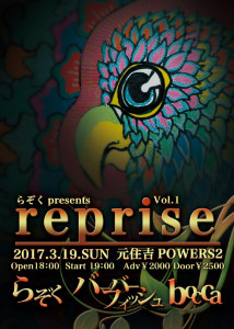 さらに詳しく »らぞくpresents”reprise Vol.1”開催決定!らぞく、バーバーフィッシュ、bocca、日本を代表するJam BandによるSuper Jammin’な一夜!踊りましょ〜春だし☆ ★reprise Vol.1〜らぞく×バーバーフィッシュ×bocca★ 2017/03/19(日)@元住吉POWERS2 OPEN 18:00/START 19:00…