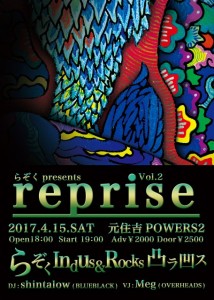 さらに詳しく »らぞく presents “reprise Vol.2”開催決定!若手ナンバーワンJam Band”Indus&Rocks”、ルーツミュージックを根源に秘境ムーミン谷Studioに集う凸凹集団”凸ラ凹ス”を迎えて盛大にやらかします! ★reprise Vol.2〜らぞく×Indus&Rocks×凸ラ凹ス★ 2017/04/15(土)@元住吉P…