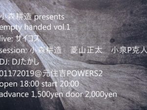 さらに詳しく »パリから一時帰国中のドラマー小森耕造とその仲間たちによるPARTY、”empty handed vol.1” 開催決定!奇妙な世界を描くバンド”ザイコス”と小森耕造、小泉P克人、菱山正太のセッションバンドが登場!人気DJ、DJたかしを招いてのディープな一夜。 ★小森耕造 presents, “empty handed vol.1″ PARTY〜Zycos×セ…