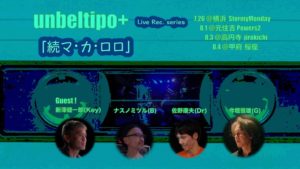 ★unbeltipo+〜LIVE Rec.シリーズ「続マ・カ・ロロ」★ 2019/08/01(木)@元住吉POWERS2 OPEN 18:00/START 20:00 ADV¥3200/DOOR¥3700 ※学生証提示で¥1,000off ■LIVE unbeltipo 今堀恒雄(G) ナスノミツル(B) 佐野康夫(Dr) ゲスト:新澤健一郎(Key) ■T…