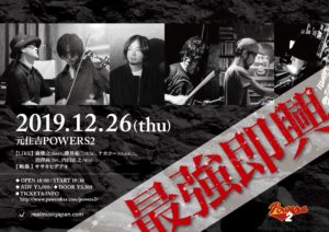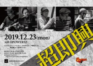 さらに詳しく »音楽とは?即興とは?その問いに対するひとつの答えがここにある。 Listen to real music. ★超即興〜ナスノミツル+山本達久+内橋和久+外山明+内田直之★ 2019/12/23(月)@元住吉POWERS2 OPEN 18:30/START 20:00 ADV¥3000/DOOR¥3500 ■LIVE ナスノミツル(Bass) 山本達久(Dr)…