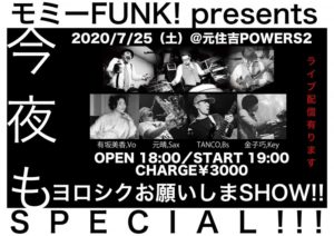 さらに詳しく »モミーFUNK! presents 今夜もヨロシクお願いしまSHOW!!!SPECIAL!!!開催決定!泣く子も笑うモミーFUNK!が豪華ゲスト陣を迎えて盛大に盛り上げちゃいまSHOW! ★モミーFUNK! presents 今夜もヨロシクお願いしまSHOW!!!SPECIAL!!!★ 2020/7/25(土)@元住吉POWERS2 OPEN 18:00/S…