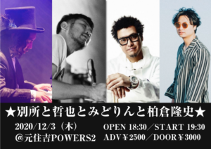 さらに詳しく »インストバンド界のレジェンドSax奏者・元晴によるジャムセッション「music lab.」熱いご要望にお応えしてVol.4開催決定! ★ジャムセッション〜MOTOHARU presents music lab. Vol.4★ 2020/12/23(水)@元住吉POWERS2 OPEN 18:30/START 19:30 CHARGE 参加者¥2000 観覧者…