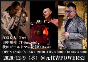 さらに詳しく »ジャズドラマー江藤良人、あらゆるシーンで活躍するSax奏者・田中邦和、SOIL&”PIMP”SESSIONSのベーシスト秋田ゴールドマン紀彰による”JAZZ”な一夜。お楽しみに☆ ★江藤良人+田中邦和+秋田ゴールドマン紀彰★ 2020/12/9(水)@元住吉POWERS2 OPEN 18:30/START 20:00 ADV¥3000/DOOR¥35…