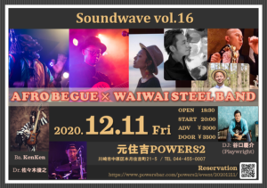 さらに詳しく »今回のスペシャルゲストは… Playwright仲間のスティールパンバンド・WAIWAI STEEL BAND! そしてDJはPlaywrightディレクター谷口慶介! 2組が繰り出す躍動感溢れる音楽で踊らずにはいられない! 2020年の締め括りにふさわしい最高で最幸な夜になる! ★Soundwave vol.16〜Afro Begue×WAIWAI STE…