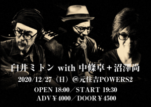 さらに詳しく »実力派シンガーソングライター臼井ミトンと中條卓+沼澤尚による最強リズムセクションによる臼井ミトントリオワンマンLIVE!今年最後のミトントリオです!お見逃しなく☆ ★臼井ミトン with 中條卓+沼澤尚ワンマンLIVE★ 2020/12/27(日)@元住吉POWERS2 OPEN 18:00/START 19:30 ADV¥4000/¥4500(50名限定)…