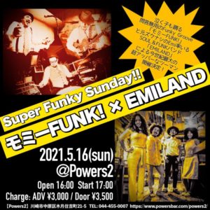さらに詳しく »泣く子も踊る問答無用のFunky GrooveモミーFUNK!と元ズクナシのEmi率いるSOUL&FUNKバンドEMILANDによる今世紀最大の超アッパーなツーマン開催決定! 注)柔軟体操を済ませてからご来場下さいませ。 ★SUPER FUNKY SUNDAY〜モミーFUNK! × EMILAND★ 2020/5/16(日)@元住吉POWERS2 OPEN …