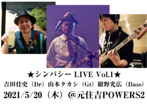 さらに詳しく »まん延防止要請延長の為、開場・開演時間が変更となります。 オンライン呑みトーク配信、Barよしふみ 2号店 「シンバシー」から派生したライブ 「シンバシー LIVE vol.1」 吉田佳史(Dr) 山本タカシ(Gt) 紺野光広(Bass) 3人のセッションとトークをお楽しみに! ★シンバシー LIVE Vol.1★ 2021/5/20(木)@元住吉POWER…