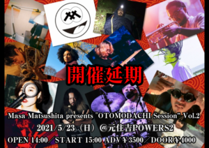 さらに詳しく »都合により開催延期となりました。日程決まり次第お知らせ致します。何卒よろしくお願い致します。 ★Masa Matsushita presents "OTOMODACHI Session” Vol.2★ 2021/5/23(日)@元住吉POWERS2 OPEN 14:00/START 15:00 ADV¥3500/DOOR¥4000 要予約:規定人数に達し次…