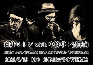 さらに詳しく »まん延防止要請延長の為、開場・開演時間が変更となります。 実力派シンガーソングライター臼井ミトンと中條卓+沼澤尚による最強リズムセクションでお届けする極上の一夜!お見逃しなく☆ ★臼井ミトン with 中條卓+沼澤尚ワンマンLIVE★ 2021/5/19(水)@元住吉POWERS2 OPEN 17:00/START 18:00 ADV¥3000/DOOR¥3…