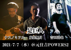 さらに詳しく »超絶ギタリスト鬼怒無月・生誕57周年記念ライブ5DAYS開催決定!初日は是巨人から参ります!誕生日当日です☆ ★是巨人〜鬼怒無月+ナスノミツル+吉田達也★ 2021/7/7(水)@元住吉POWERS2 OPEN 18:00/START 19:00 ADV¥3000/DOOR¥3500 要予約:規定人数に達し次第受付終了とさせて頂きます。 1ドリンク+1フー…