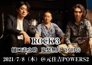 さらに詳しく »超絶ギタリスト鬼怒無月・生誕57周年記念ライブ5DAYS開催決定!二日目は頭脳警察のサポートを務めるリズム隊と共に新バンド「ROCK3」が登場! ★ROCK3〜鬼怒無月+宮田岳+樋口素之助★ 2021/7/8(木)@元住吉POWERS2 OPEN 18:00/START 19:00 ADV¥3000/DOOR¥3500 要予約:規定人数に達し次第受付終了と…