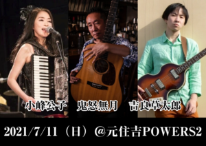 さらに詳しく »超絶ギタリスト鬼怒無月・生誕57周年記念ライブ5DAYS開催決定!最終日は小峰公子、吉良草太郎と共にZABADAKの名曲をお届けします! ★鬼怒無月+小峰公子+吉良草太郎★ 2021/7/11(日)@元住吉POWERS2 OPEN 17:00/START 18:00 ADV¥3000/DOOR¥3500 要予約:規定人数に達し次第受付終了とさせて頂きます。…