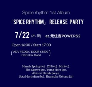 さらに詳しく »Ba.森光奏太とDr.上原俊亮 によるユニット、Spice rhythm の1st Album "SPICE RHYTHM"のリリースパーティー開催決定!ZIN(from Soulflex)、Hanah Springなど多数のSpecial guestを迎え、SoulでFunkなライブをお届けします! ★”SPICE RHYTHM" Release Part…