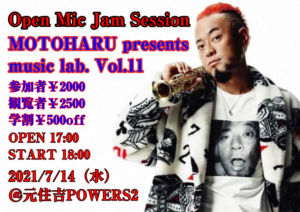 さらに詳しく »オープンマイク・ジャムセッション MOTOHARU presents "music lab." Vol.11 開催決定! ★MOTOHARU presents "music lab." Vol.11★ 2021/7/14(水)@元住吉POWERS2 OPEN 17:00/START 18:00 参加者¥2000 観覧者 ¥2500(学割¥500off!) 要…