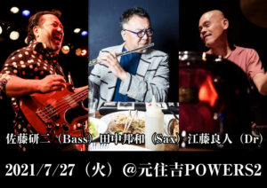 さらに詳しく »マルコシアスバンプのベーシスト佐藤研二、唯一無二のSax奏者・田中邦和、ジャズドラマー江藤良人による予測不能のスーパーセッション!制御不能の爆笑トークもお楽しみに☆ ★佐藤研二+田中邦和+江藤良人★ 2021/7/27(火)@元住吉POWERS2 OPEN 18:00/START 19:00 ADV¥3000/DOOR¥3500 要予約:規定人数に達し次第…