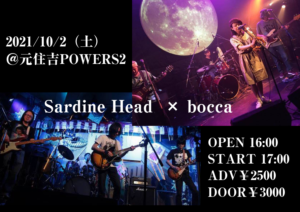 メンバーの都合によりboccaの出演がキャンセルになりました。Sardine HeadワンマンLIVEとなります。何卒よろしくお願い致します。 ★bocca × Sardine Head★ 2021/10/2(土)@元住吉POWERS2 OPEN 16:00/START 17:00 ADV¥2500/DOOR¥3000 要予約:規定人数に達し次第受付終了と…