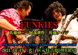 さらに詳しく »シアターブルックの佐藤タイジ、マルコシアス・バンプの佐藤研二、元THE COLLECTORSの阿部耕作によるFUNKIESワンマンLIVE開催決定!珠玉の名曲の数々をファンキーに再現します!中毒者続出中☆ ★FUNKIESワンマンLIVE〜佐藤タイジ+佐藤研二+阿部耕作★ 2021/10/19(火)@元住吉POWERS2 OPEN 18:00/START 1…
