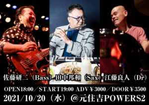 さらに詳しく »マルコシアスバンプのベーシスト佐藤研二、唯一無二のSax奏者・田中邦和、ジャズドラマー江藤良人による予測不能のスーパーセッション!制御不能の爆笑トークもお楽しみに☆ ★佐藤研二+田中邦和+江藤良人★ 2021/10/20(水)@元住吉POWERS2 OPEN 18:00/START 19:00 ADV¥3000/DOOR¥3500 要予約:規定人数に達し次…