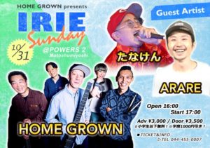 さらに詳しく »日本を代表するレゲエバンドHOME GROWN presents IRIE SUNDAY開催決定!ARAREとたなけんをゲストに迎えアゲアゲでいきます!お楽しみに☆ ★HOME GROWN presents IRIE SUNDAY feat.ARARE&たなけん★ 2021/10/31(日)@元住吉POWERS2 OPEN 16:00/START 17:00…