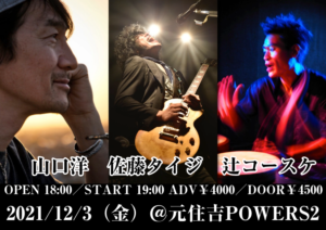 さらに詳しく »シアターブルックの佐藤タイジとHEATWAVEの山口洋と孤高のパーカッショニスト辻コースケによる年末スペシャルLIVE!珠玉の名曲の数々を爆笑トークと共にお届けします。お楽しみに☆ ★佐藤タイジ+山口洋+辻コースケ★ 2021/12/3(金)@元住吉POWERS2 OPEN 18:00/START 19:00 ADV¥4000/DOOR¥4500 要予約:…