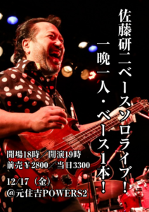 さらに詳しく »マルコシアス・バンプのベーシスト佐藤研二による”一晩一人・ベース1本!”Gibson+Marshallで滅多やたらの弾き倒し!オリジナル曲からCreamやZepなど、ロック名曲弾き語りまで。これが案外楽しいのですよ!お見逃しなく! ★佐藤研二ベースSOLOライブ「一晩一人・ベース1本!」★ 2020/12/17(金)@元住吉POWERS2 OPEN 18:0…