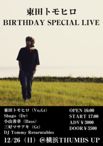 さらに詳しく »今年もやります!東田トモヒロ BIRTHDAY SPECIAL LIVE開催決定!呑んで踊って忘年会!全員集合でお願いします☆ ★東田トモヒロ BIRTHDAY SPECIAL LIVE★ 2021/12/26(日)@横浜THUMBS UP OPEN 16:00/START 17:00 ADV¥3000/DOOR¥3500 ■LIVE 東田トモヒロ(Vo,G…