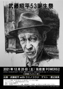 さらに詳しく »★武藤昭平53誕生祭★ 2021/12/25(土)@元住吉POWERS2 OPEN 16:30/START 17:30 前売 4,800円/当日 5,300円(&1フード+1ドリンク) ※来場者プレゼント有り 出演:武藤昭平withウエノコウジ ゲスト:渡辺俊美 ■チケット予約方法 メール予約受付:10月30日(金)20:00~ メールアドレス ukp@uk…