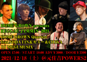 さらに詳しく »日本を代表するレゲエバンドHOME GROWNによるREGGAE JAMMIN’ 2021開催決定!ゲストにPUSHIM等のサポートで活躍するギタリストNODATINとモミーFUNK!のモミー、そしてシンガーのCHIKAを迎えた年末スペシャル!忘年会だよ〜全員集合☆ ★HOME GROWN presents REGGAE JAMMIN’ 2021★ 2021…