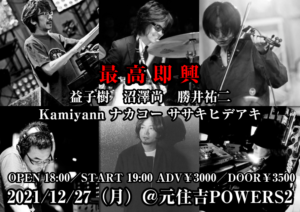 さらに詳しく »元スーパーカーのナカコー、ROVOの勝井祐二と益子樹、GROOVEドラマー沼澤尚、 MIXエンジニアKamiyann、映像ササキヒデアキによる完全即興LIVEが実現!お見逃しなく☆ ★最高即興〜ナカコー+勝井祐二+益子樹+沼澤尚+Kamiyann+ササキヒデアキ★ 2021/12/27(月)@元住吉POWERS2 OPEN 18:00/START 19:00…