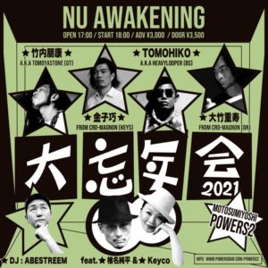 さらに詳しく »元SUPER BUTTER DOGの竹内朋康とTOMOHIKO、cro-magnonの金子巧と大竹重寿による「NU AWAKENING〜大忘年会2021」開催決定!ゲストボーカルに椎名純平とKeyco、DJ ABESTREEMを迎えた年末スペシャル!お楽しみに☆ ★NU AWAKENING〜大忘年会2021★ 2021/12/28(火)@元住吉POWERS2…