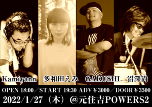 さらに詳しく »本公演はベーシスト鈴木渉の骨折により開催延期とさせて頂きます。楽しみにされていた皆さまにはご迷惑をおかけすることとなり大変申し訳ございません。新たな日程決まり次第またお知らせ致します。 ★The Яeverse〜竹内朋康+田中義人+鈴木渉+FUYU★ 2022/1/20(木)@元住吉POWERS2 OPEN 18:00/START 19:30 ADV¥400…